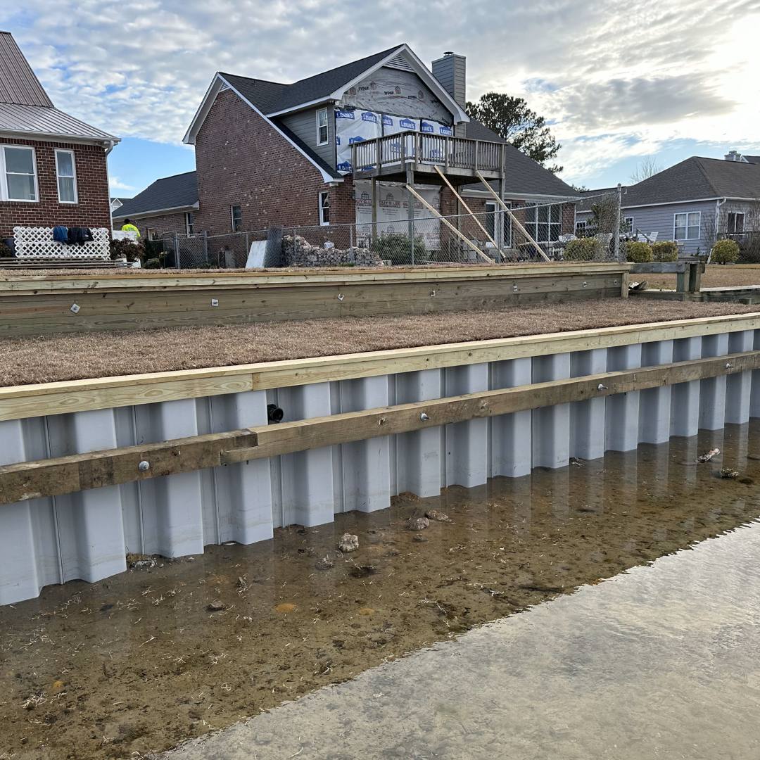 Stop erosion and protect your land. We install high-grade vinyl sheet piling (which lasts decades without rot) and traditional pressure-treated timber bulkheads.